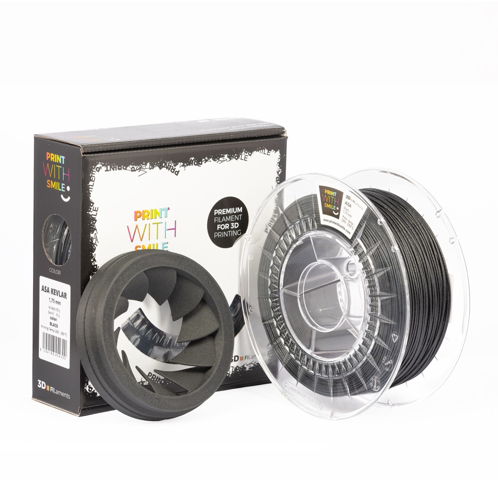 ASA KEVLAR - 1,75 mm - 850 g - BLACKASA KEVLAR - je technický kompozitní materiál složený z termoplastického kopolymeru (akrylonitril-styren-akryl) a para - aramidovým vláknem KEVLAR, které se vyznačuje vysokou pevností v tahu, srovnatelnou s uhlíkovými vlákny. ASA se dále vyznačuje vynikající odolností proti UV záření, teplu, vlhkosti a praskání při zatížení. ASA je materiál ideální pro tisk detailů vystavených povětrnostním podmínkám. Kromě toho je ASA chemicky odolný, teplotně stabilní a navíc má antistatické vlastnosti. Podobně jako ABS je to materiál petrochemického původu, ale vzhledem k nedostatku butadienu v jeho složení se tento materiál vyznačuje výrazně menším smrštěním, což je mnohem snazší pro tisk.