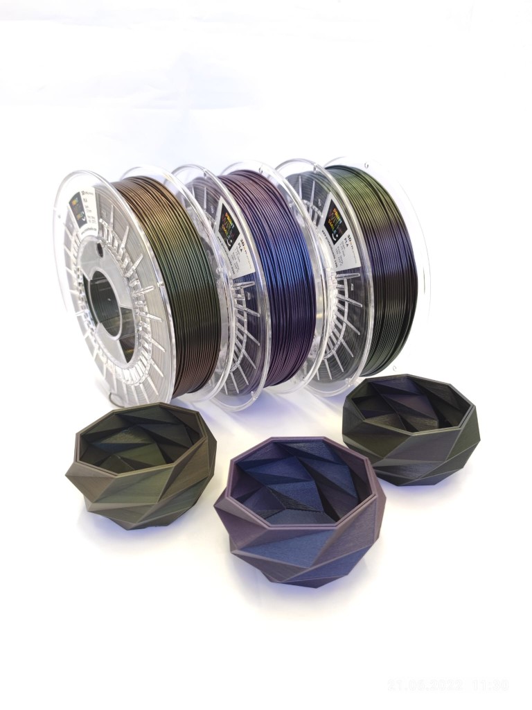 Filamenty PLA z prémiového materiálu. BICOLOR METALICKÝ efekt. Mění odstín barvy podle úhlu pohledu.